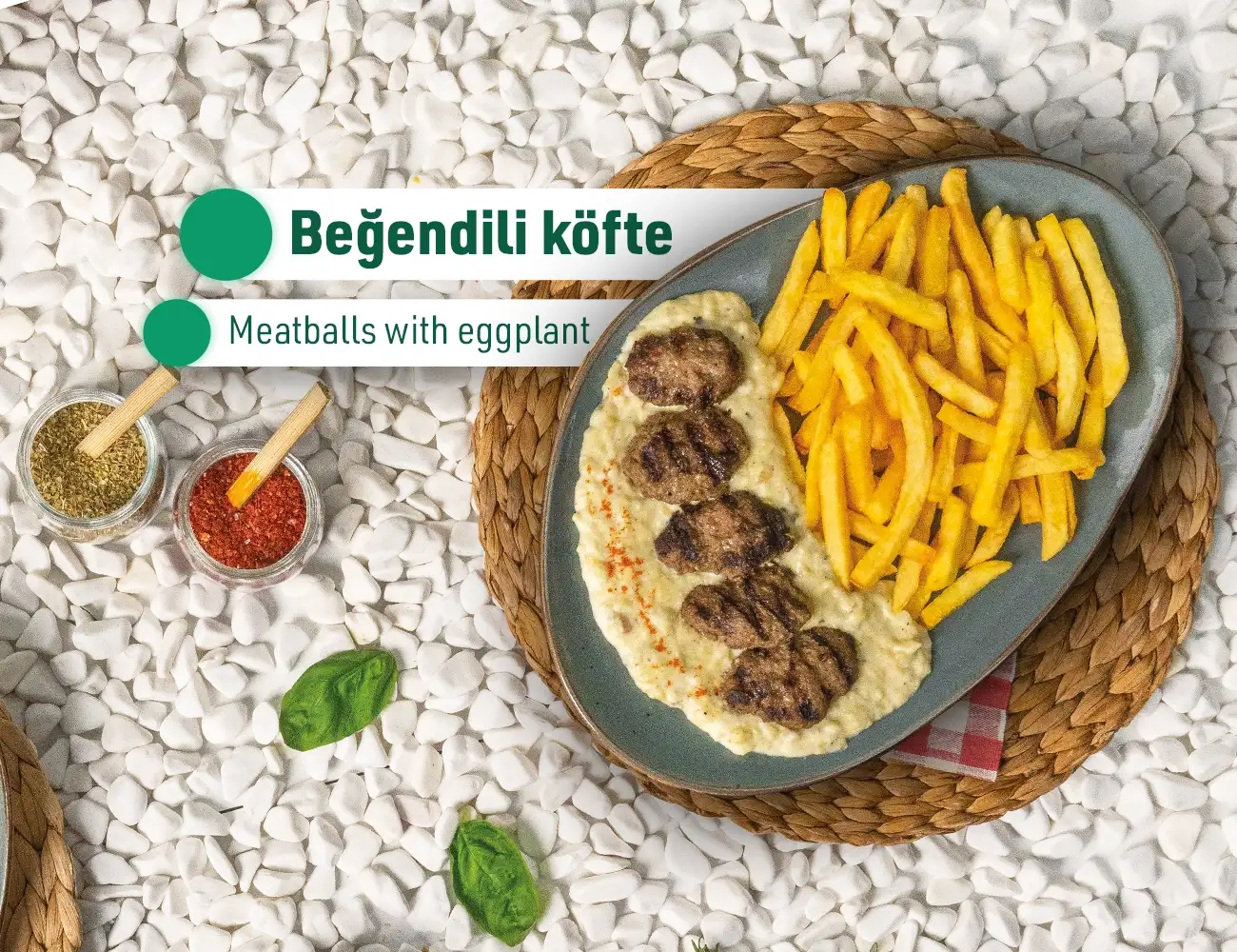 Grilled meatballs, eggplant sauce and French fries