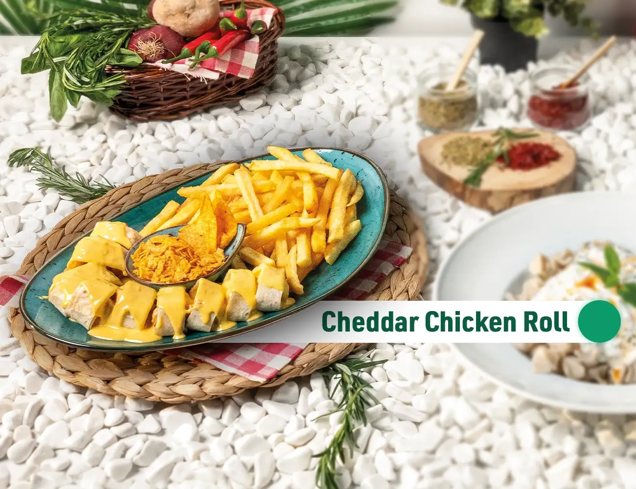Tavuk bonfile, kapya biber, yeşil biber, kremalı cheddar sos, patates kızartması ve mısır cips eşliğinde