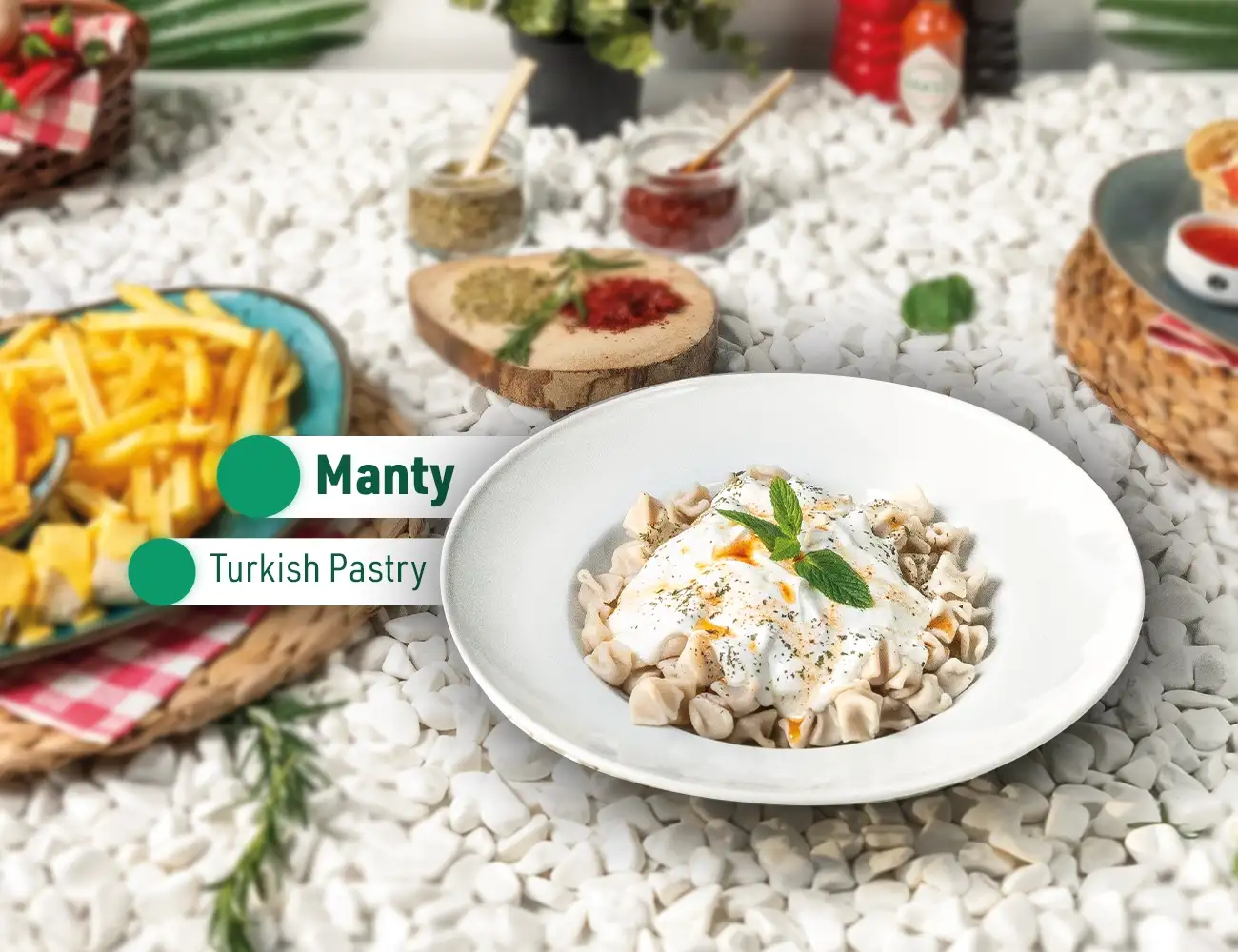 مانتی دەستی (بە ئیختیاری لەگەڵ سیر یان بەبێ سیر) لەگەڵ ماست و نەعنا و سۆسی بیبەری سوور لەگەڵ کەرە