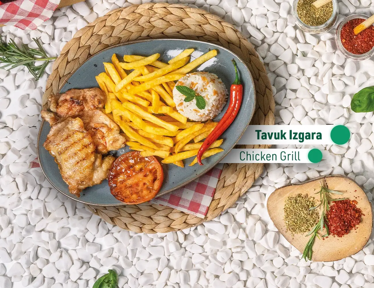 Kemiksiz tavuk pirzola, pirinç pilavı, patates kızartması, közlenmiş domates ve biber eşliğinde