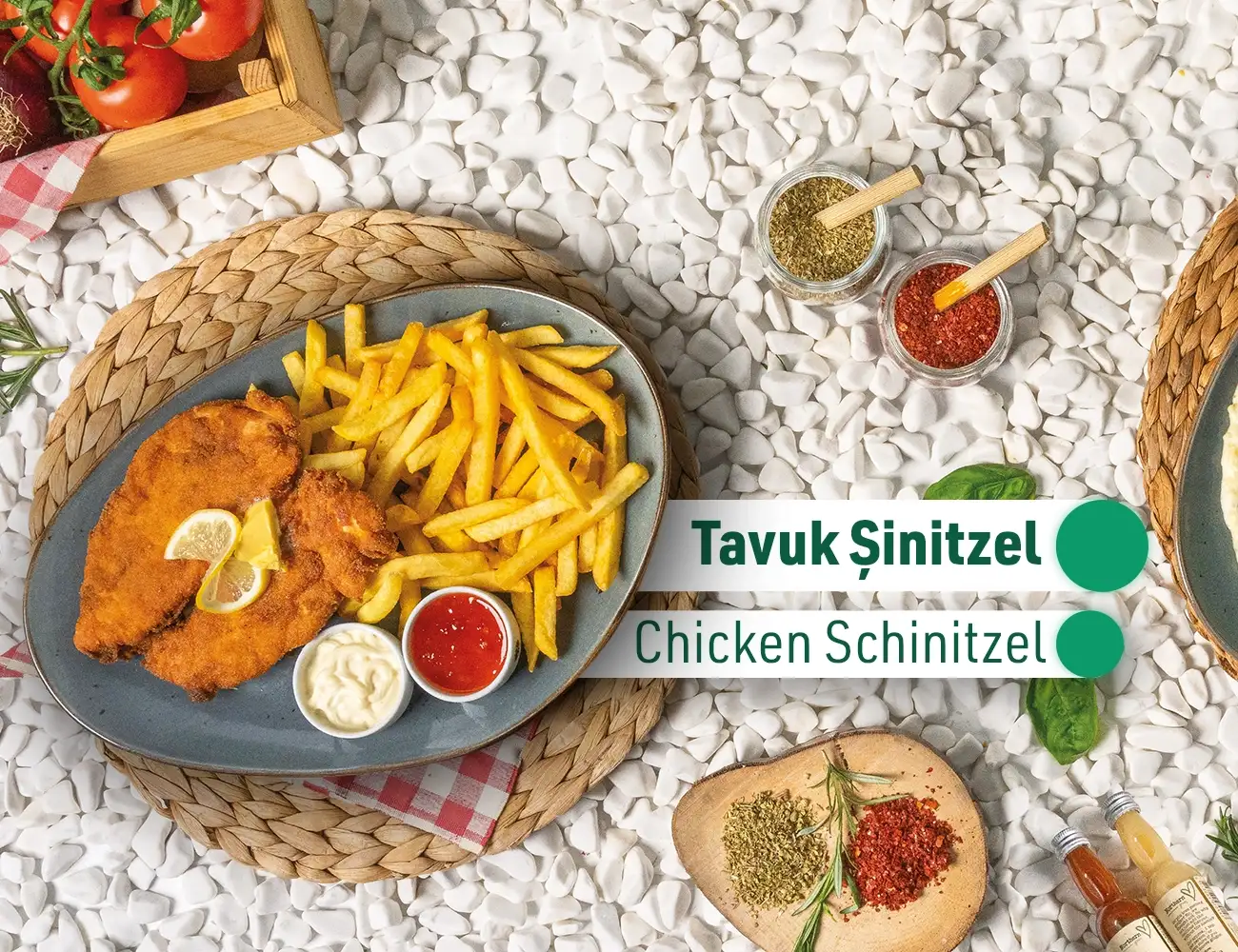 Tavuk şinitzel, patates kızartması, mayonez ve sweet chili sos eşliğinde