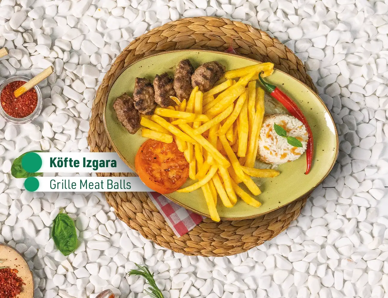 كرات اللحم، أرز بيلاف، بطاطس مقلية، طماطم مشوية وفلفل مع