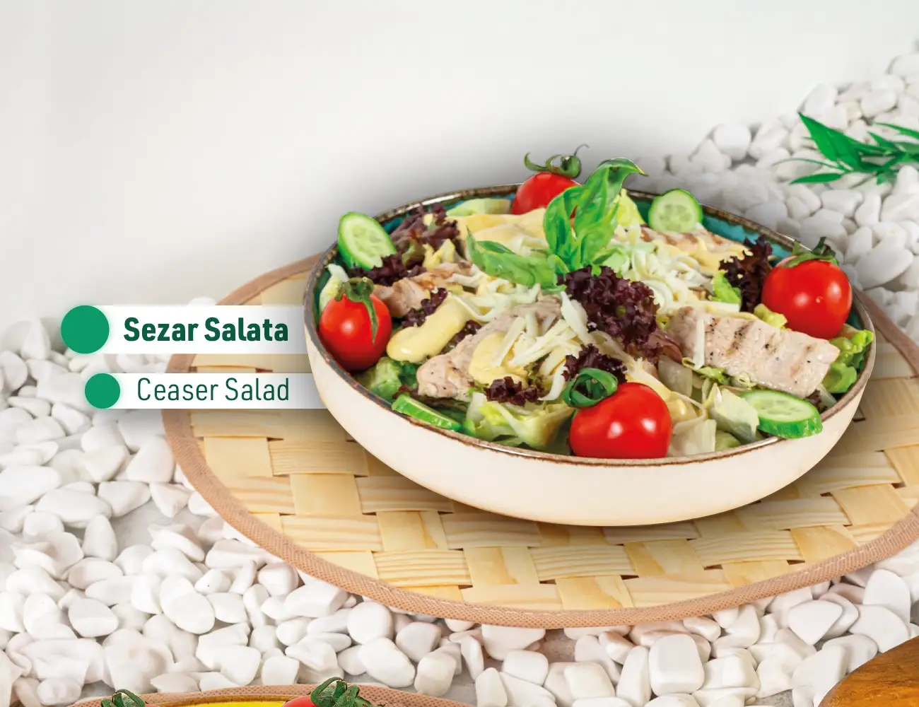 Chicken, tomato, cucumber, iceberg, Mediterranean greens, kaşar cheese with Caesar sauce