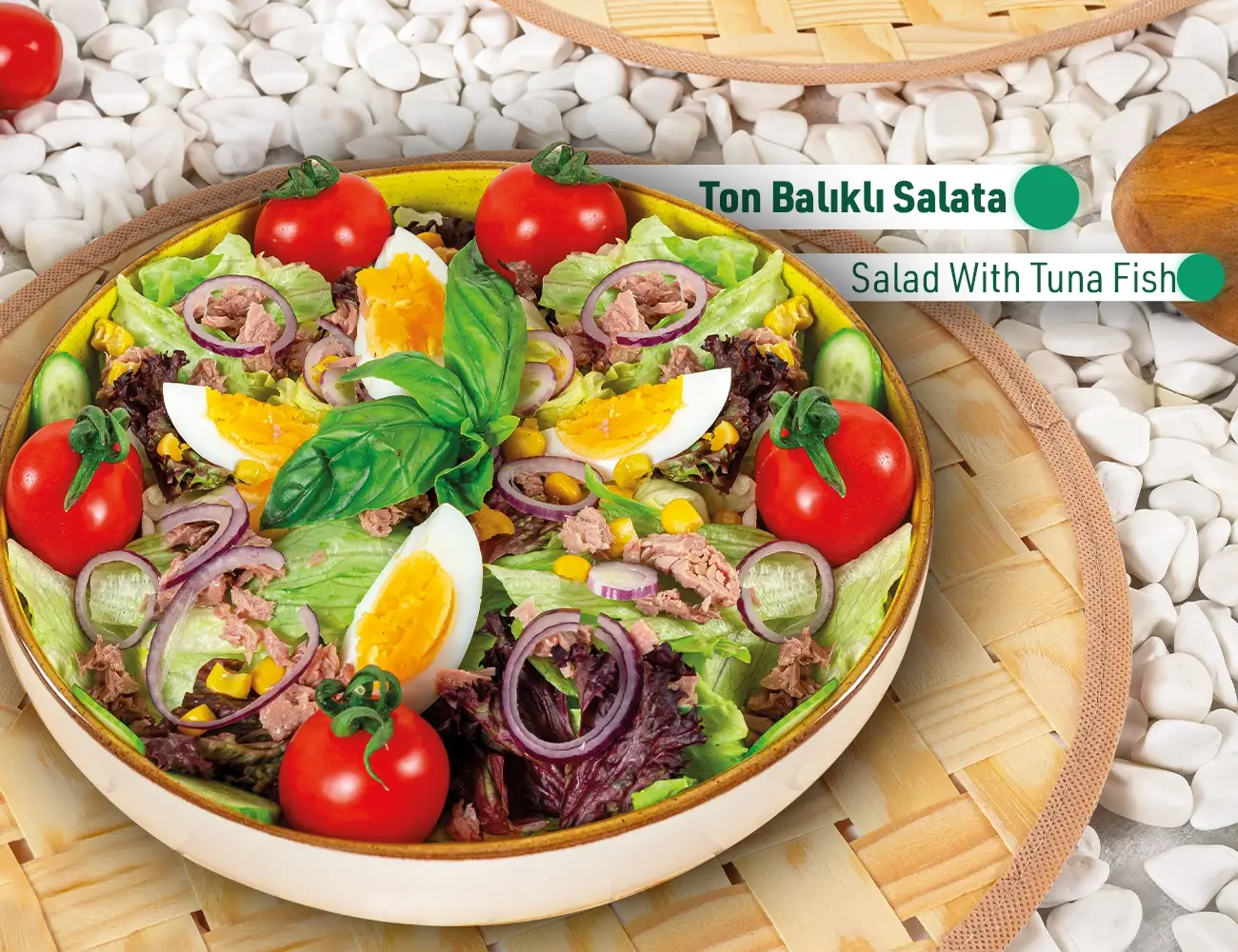 Ton balığı, Akdeniz yeşillikleri, salatalık, mısır, domates, kırmızı soğan, yumurta