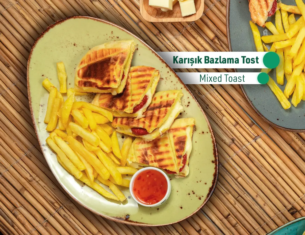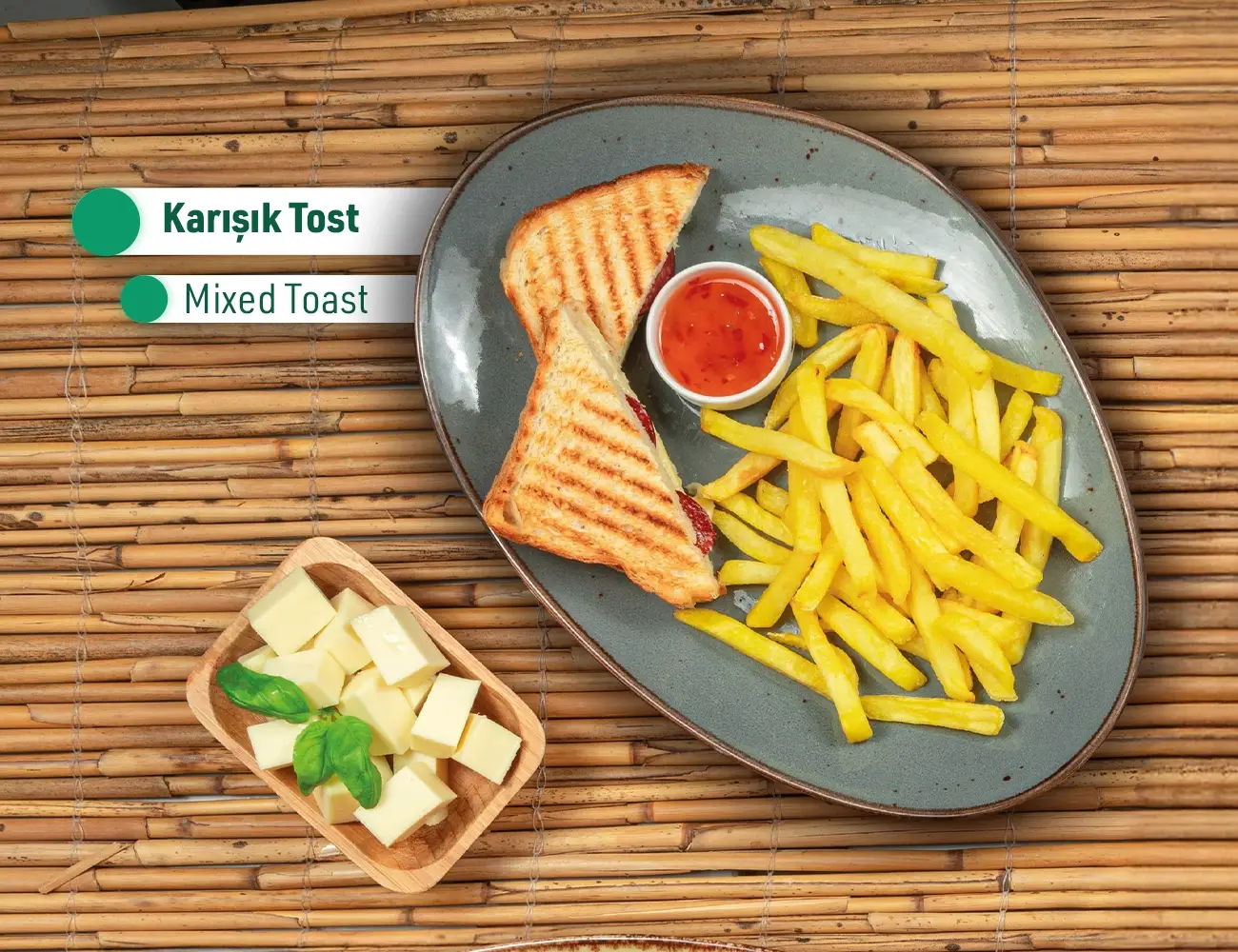 Kaşar peyniri, acı chili sos, patates kızartması eşliğinde